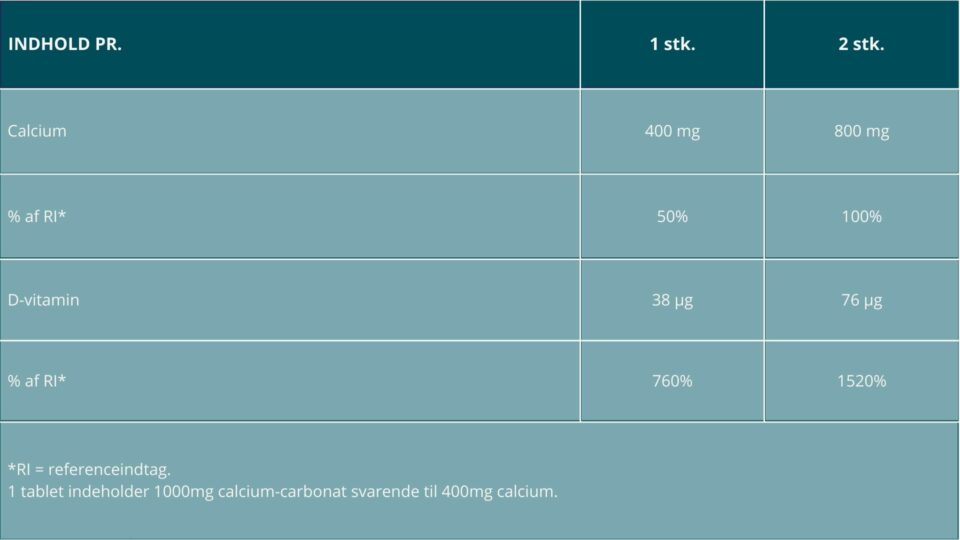 Anbefales til personer, som får en del, men ikke nok kalk gennem kosten, og som samtidigt har behov for et særlig højt tilskud af D-vitamin.