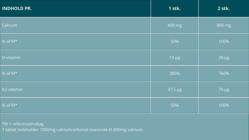 UniKalk Forte K2, Kalk 400 mg, D-vitamin 19 µg og K-vitamin 37,5 µg